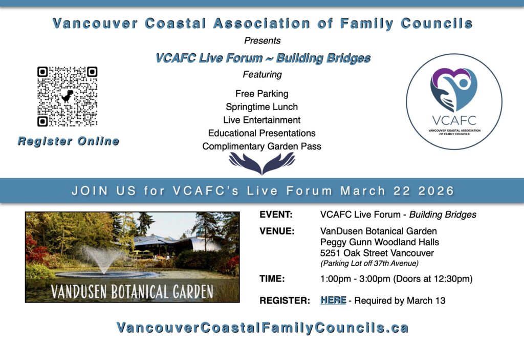 VCAFC provides a forum for networking the Family Council of Long-Term Care in the Vancouver Coastal region to discuss common issues, work to find solutions, and ultimately, share our concerns and ideas with our provincial association of family councils, a registered non-profit society named ILTCCABC.